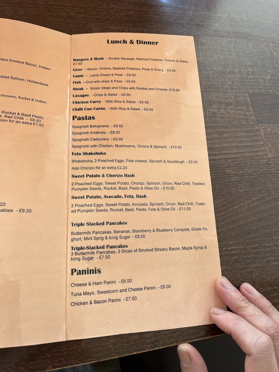 - Pastas and Light Meals: Various pasta dishes including Spaghetti Bolognaise, Spaghetti Arrabiata, Spaghetti Carbonara, and Spaghetti with chicken, mushrooms, onions, and spinach. Additional items like Feta Shakshuka, Sweet Potato & Chorizo Hash, and Sweet Potato, Avocado, Feta Hash are also available.